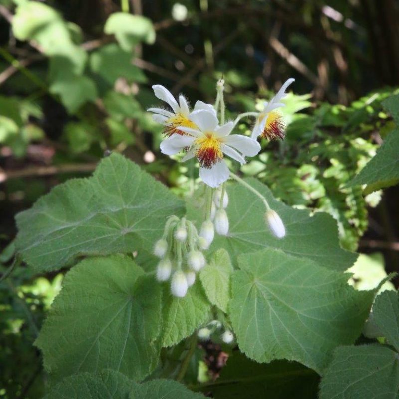 It grows particularly well on Tresco and is much admired in the Abbey Garden for its soft large lime green leaves and white showy flowers.