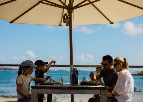 Start the day with coffee and pastries, enjoy a long, lazy beachfront lunch as the children play on the white sands below, or settle in for sundowners and a special supper as the sky reflects the colours of a Scilly sunset. Fresh, seasonal ingredients and vibrant coastal flavours are fired to perfection in our wood‑fired oven, then served with unforgettable sea views.