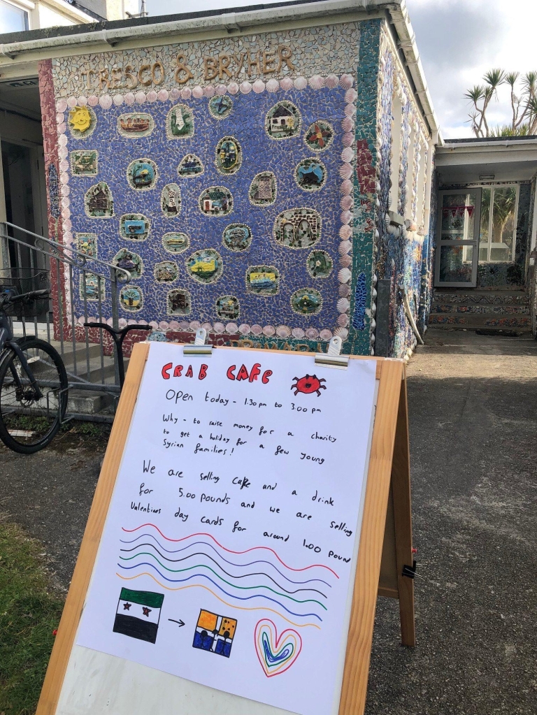 After all the anticipation, the Crab Café was open today and the children became waiters and waitresses for the afternoon. With a plethora of homemade cakes on offer and the kettle going non stop, it was a great success with visitors from across the island popping in. The whole event was in order to raise money for families struggling in Syria - many of whom face daily toil that we find difficult to even imagine from the safe, peaceful shores of Tresco and Bryher.