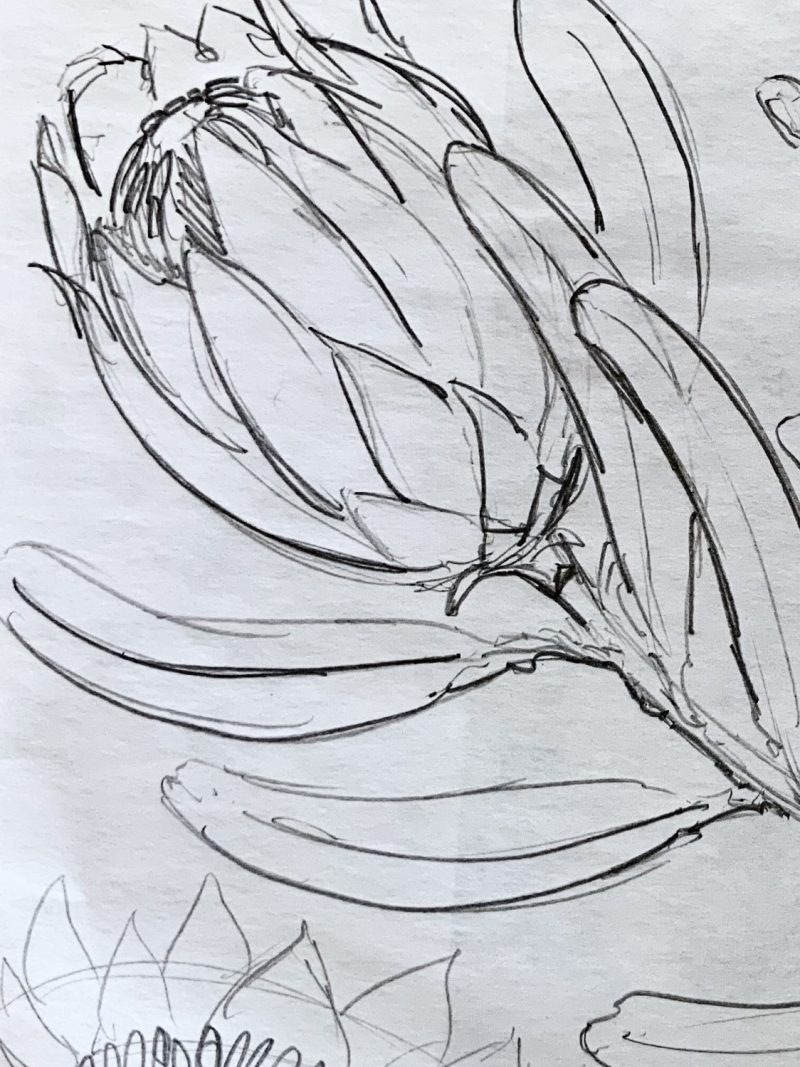 Lotty B’s print "Protea" was inspired by the King Proteas found on Tresco. The photograph below was taken by Mike Nelhams who, until recently, was Head Gardener for very many years. During his early tenure he had to cope with the extremely rare icy weather of January 1987 which destroyed much of the garden swiftly followed by the dreadful hurricane of January 1990. The replanting that followed included the Proteas, by now a stalwart in the Tresco landscape. From this, Lotty created this original artwork (below) which she then transformed into a screen print.