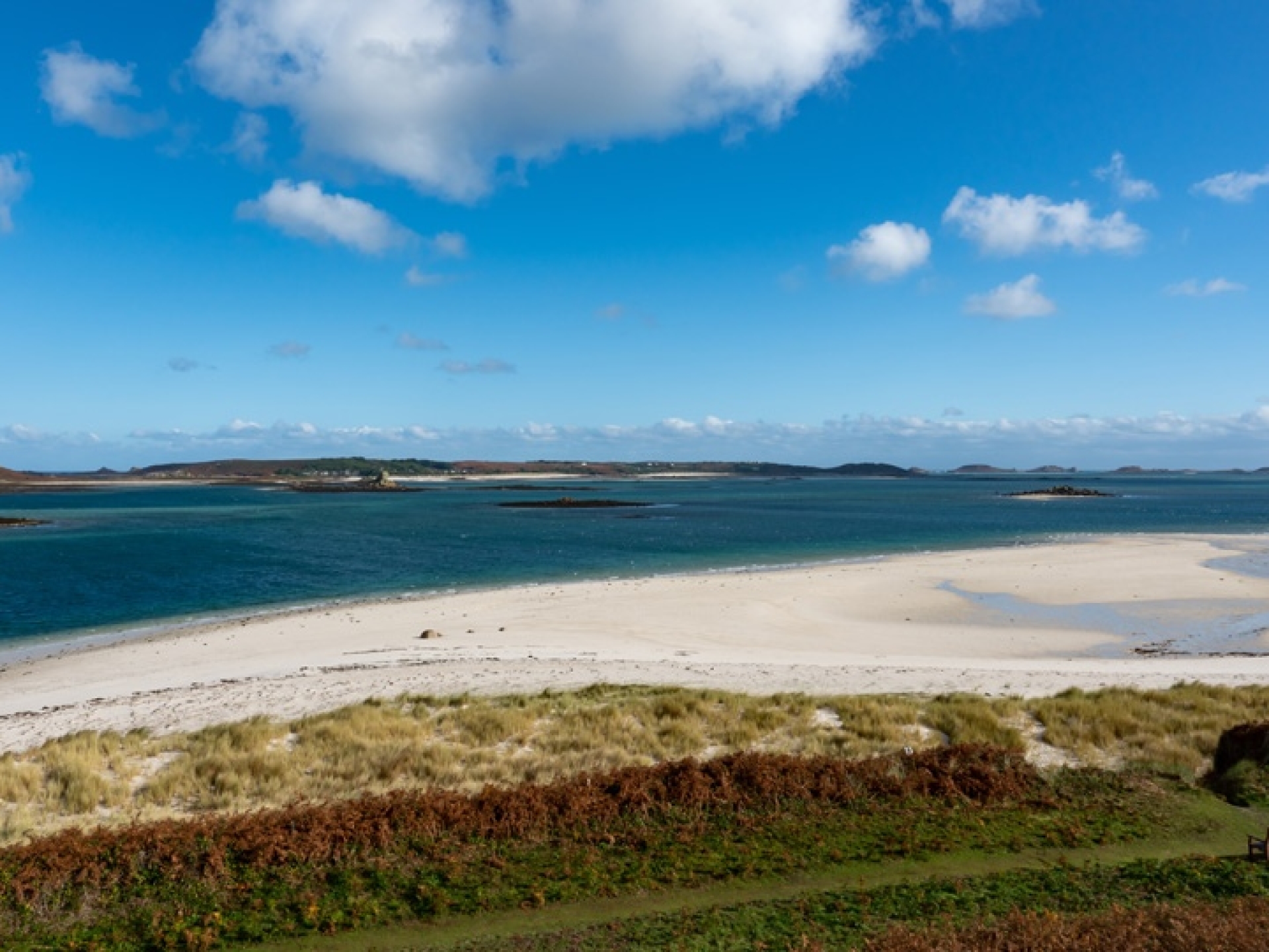 Also located on the island's eastern edge, both the Ruin Beach Café and the spa facilities are within easy reach. The master bedroom balcony enjoys evocative views across the dunes of Green Porth, with the Old Blockhouse crowning the distant promontory, urging you out for autumnal island adventures.