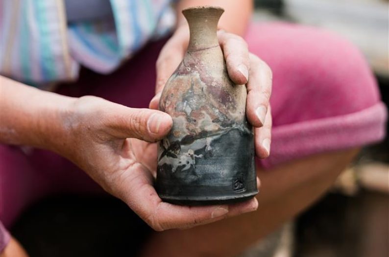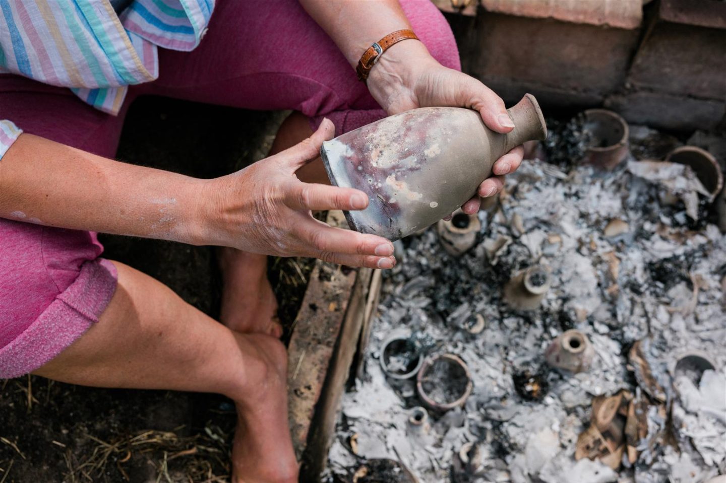 When it comes to her creative work, her sense of fun is evident. She has a kiln, but also works with a fire pit, replicating a traditional form of pottery that’s been dated back to around 3,500 BC. It’s a process that’s not without its quirks, however.
