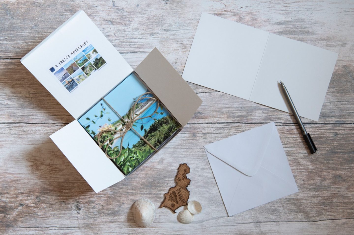 An 8-pack of greetings cards, featuring photography by Ellie Tabron, Tresco local. Ellie has captured a variety of beachy, botanical scenes – blank inside for your messages.