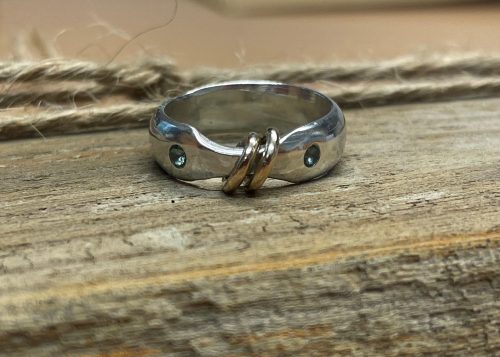 Donated by the artist, a romantic design made from sterling silver with two revolving rings and ethically sourced gemstones. Having spent many happy holidays on Tresco as a child, Julian continues to draw on the islands for inspiration to this day.