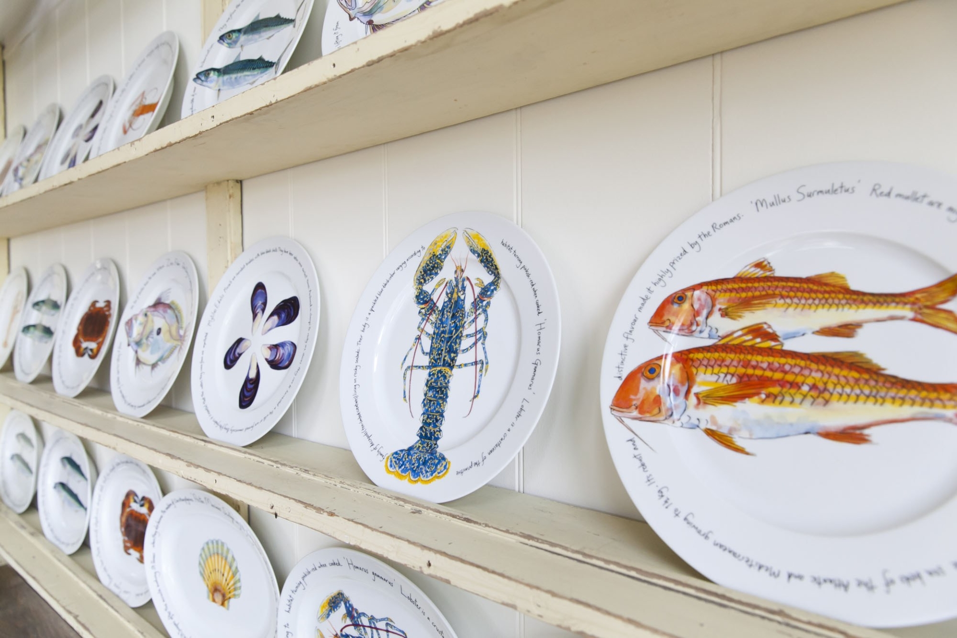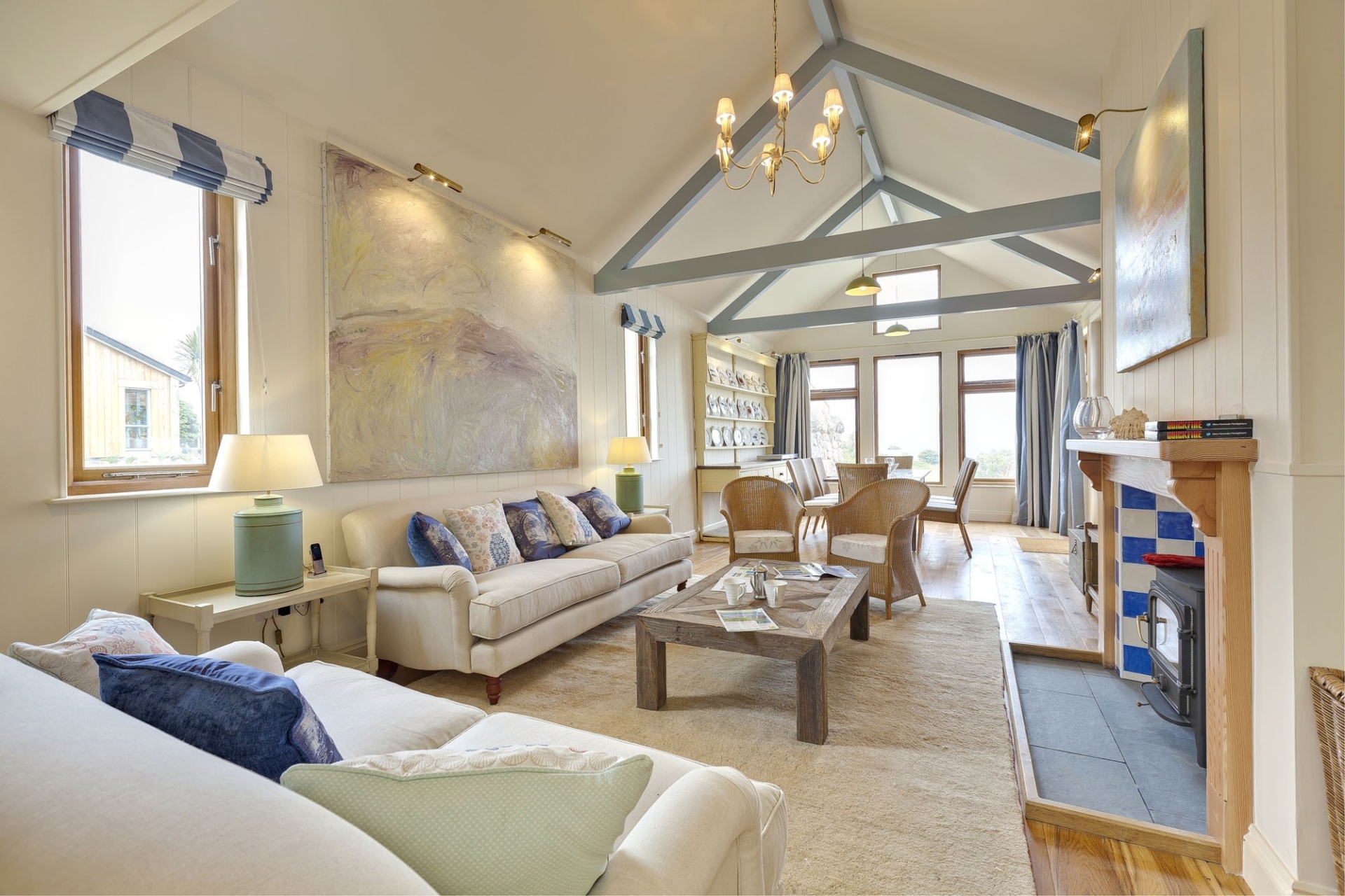 This beachy escape has marine-themed hints throughout, from shelves of sea treasures in the master bedroom, dinner plates adorned with painted lobsters and mackerel, and graduated shades of blue across fabrics, furnishings and the exposed beams in the open plan lounge and dining space.