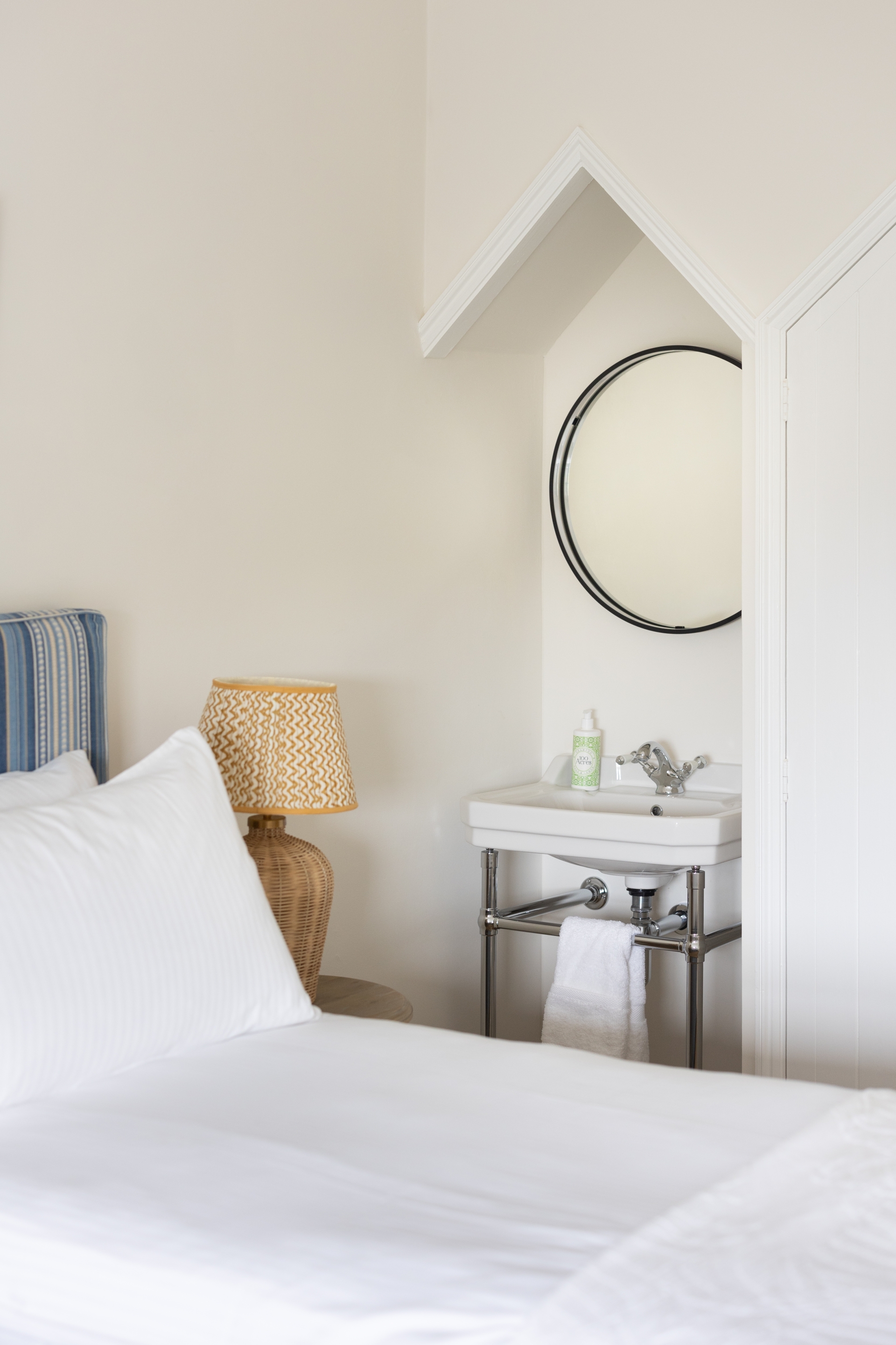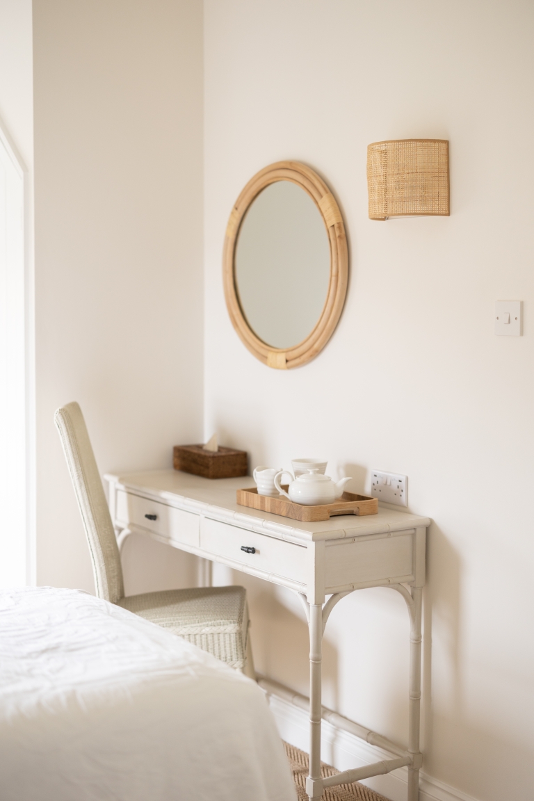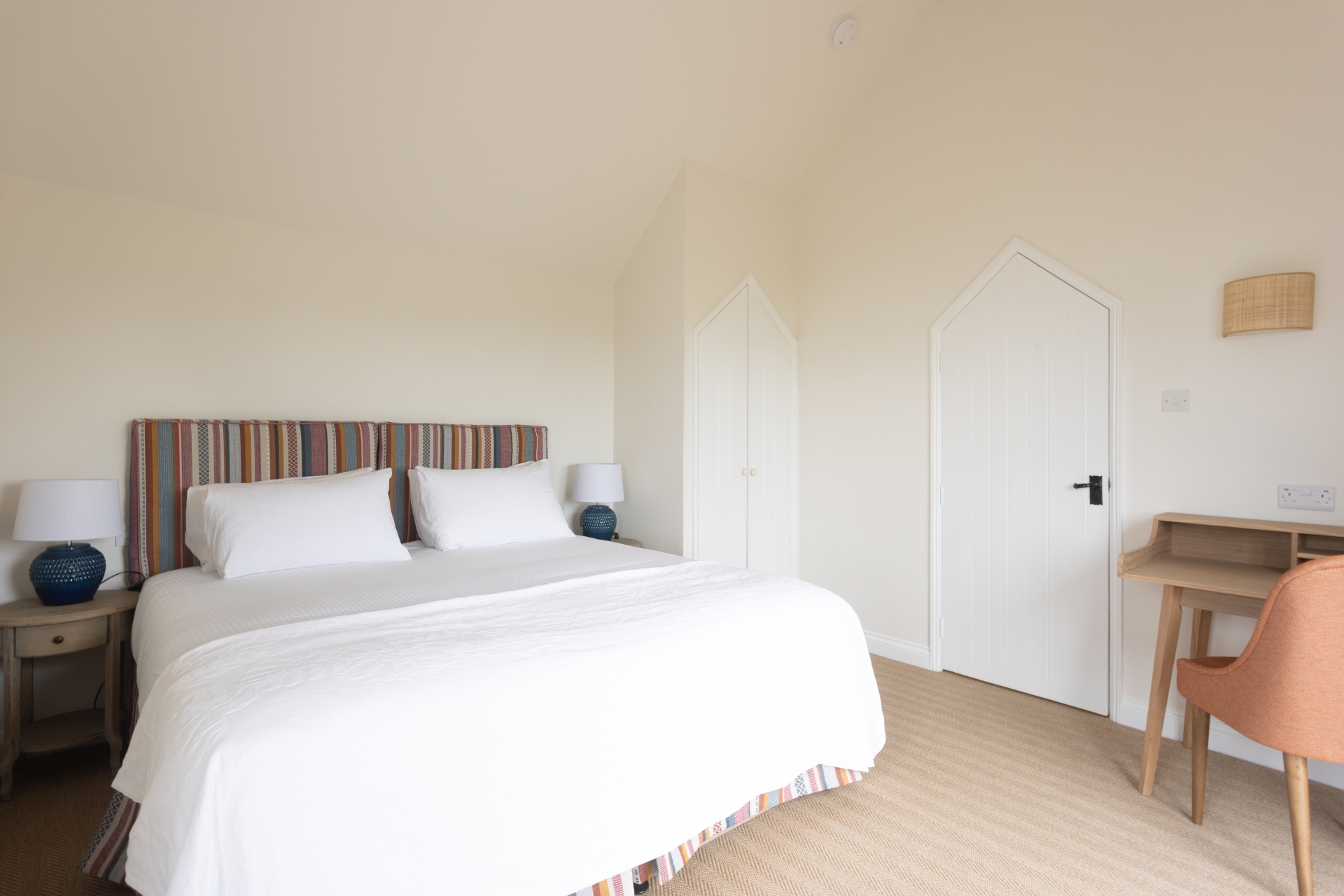 Outside, the garden incorporates a large lawn and patio space which circles around the property to take advantage of the sea views. Open the garden gate and within a few steps you can be meandering the soft white sands of Farm Beach below.