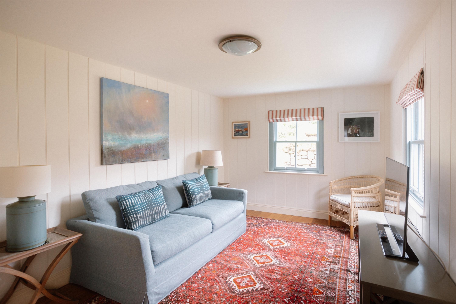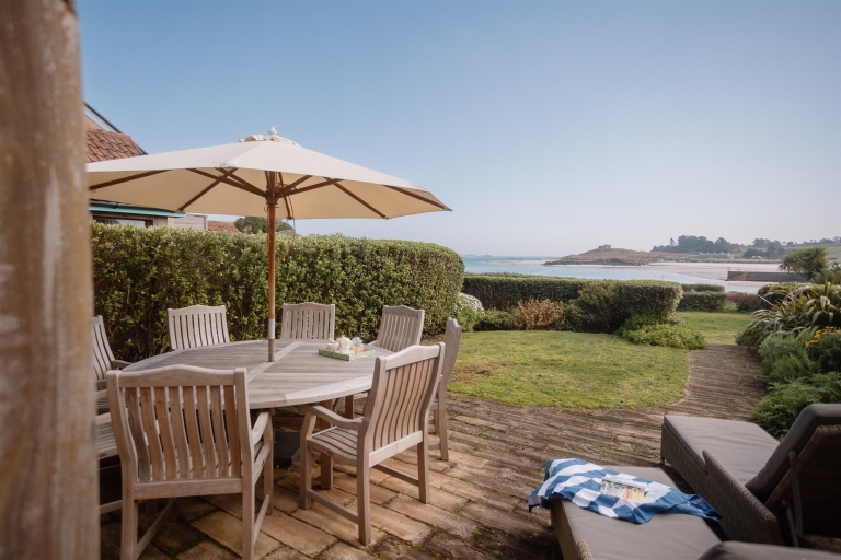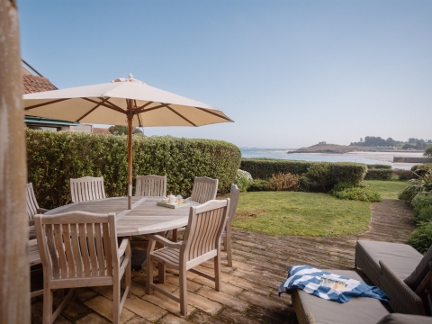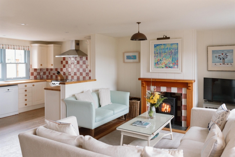 Outside, a small terrace sits just off the living space - a quiet spot for coffee or something simple to eat, framed by coastal planting. Beyond, the cottage opens directly onto the Sea Garden lawn, so space stretches out in front of you - somewhere to wander, to sit in the sun, or to drift down towards the water.