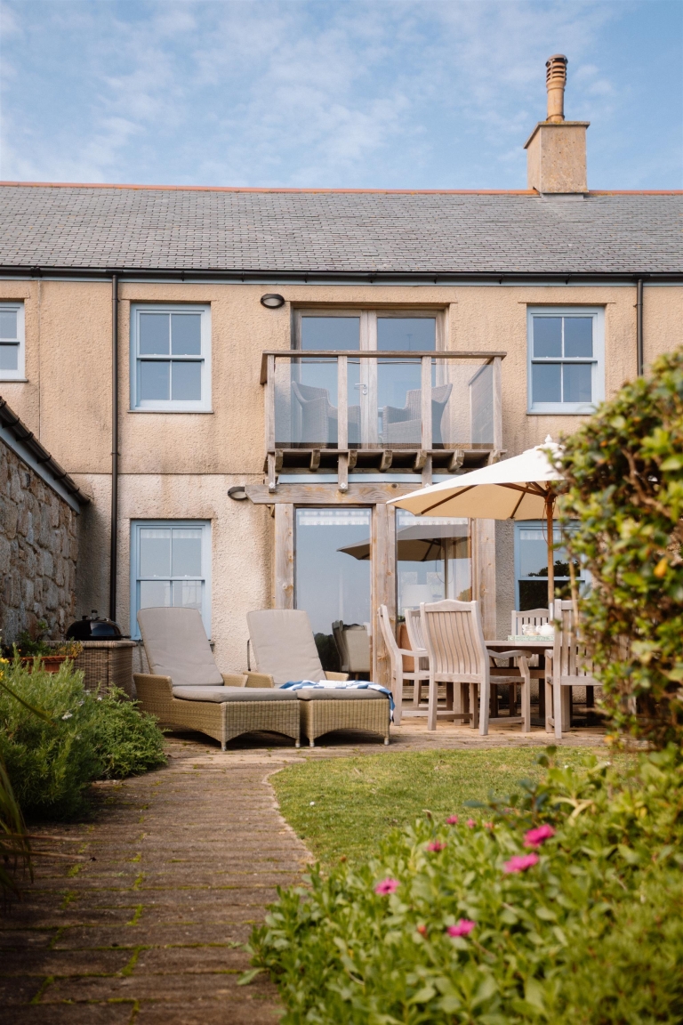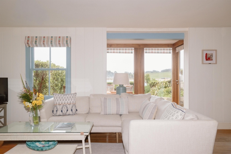 Light-filled Samphire sits on Tresco’s eastern shore, opening onto the Sea Garden lawn with the sea just beyond.