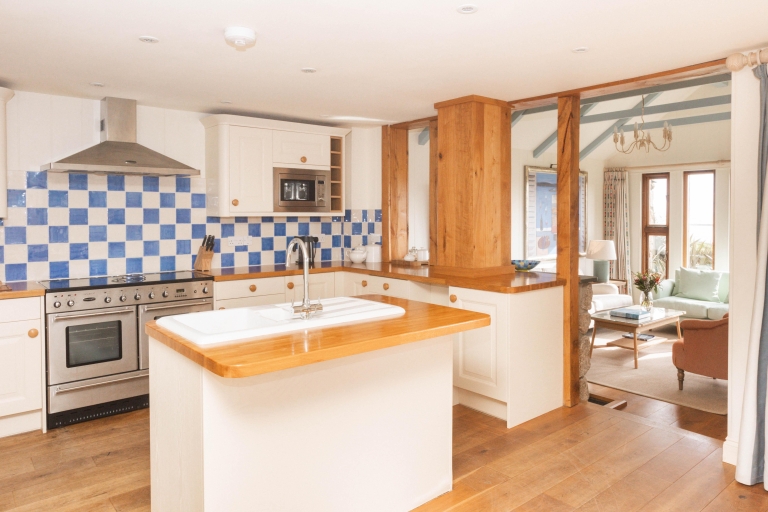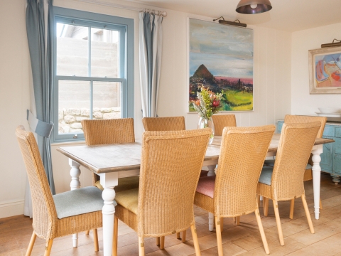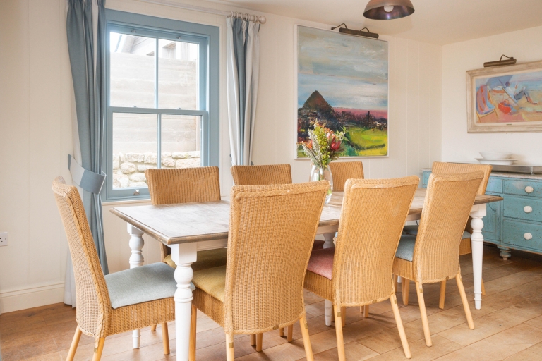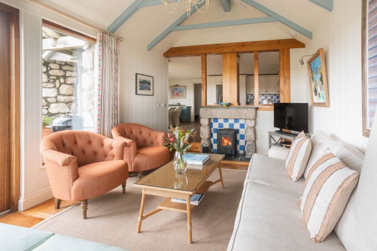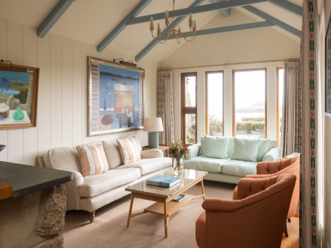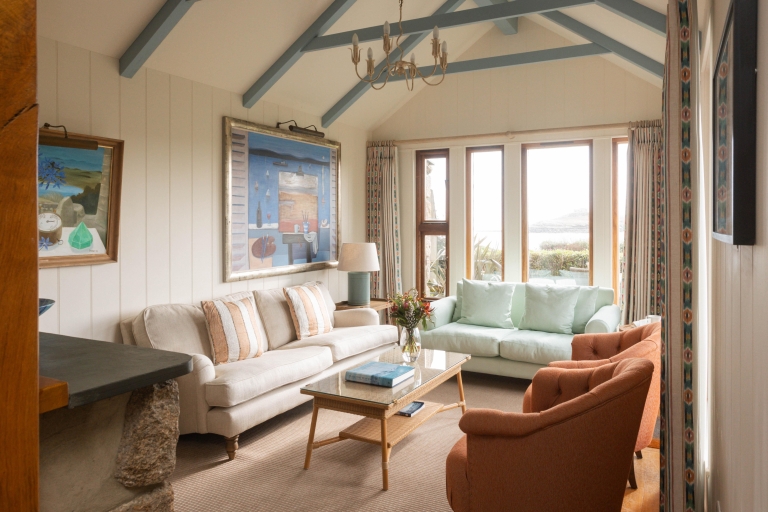 On entering, you’ll find a cosy TV room to your left, or on the right an expansive kitchen and dining space, with living room snugly ensconced down a couple of steps, framed with sea views from the surrounding windows. Two sets of patio doors lead from separate corners of the living space out to the sun terrace.