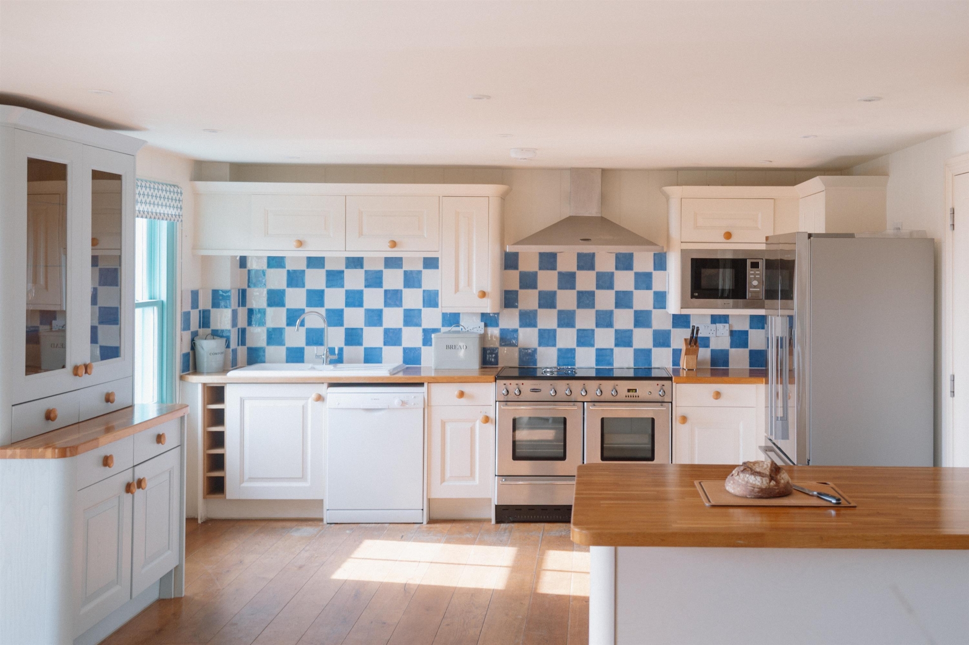 Upstairs, four comfortable bedrooms look out towards the sea, giving a sense of calm and space, while oak floors, underfloor heating and a log burner bring an easy, understated comfort throughout.